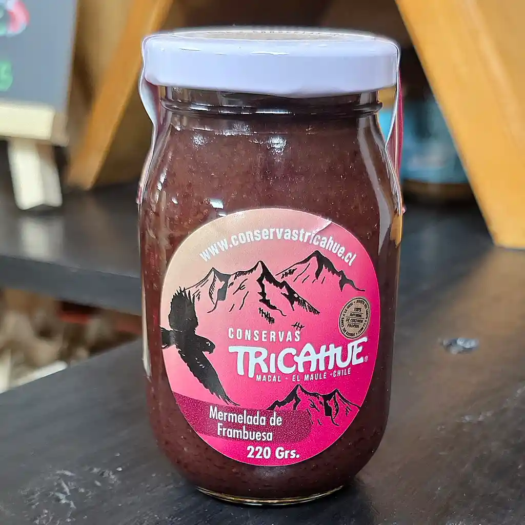 Mermelada hecha de Frambuesa. Bajo contenido de azúcar, sin preservantes ni ingredientes artificiales. Frasco de 220 grs.