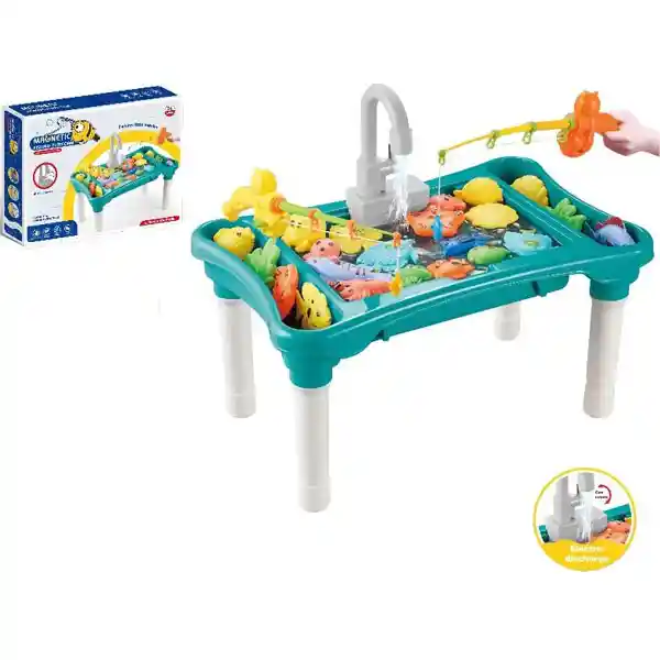 Sumérgete en la diversión con nuestra mesa de juego que incluye un emocionante juego de pescar magnético! Viene con dos cañas para pescar y un grifo mágico que hace fluir el agua por succión. ¡Ideal para horas de entretenimiento y habilidad en cada pesca! Medidas: 47x35cm caja Pilas: 2 AA