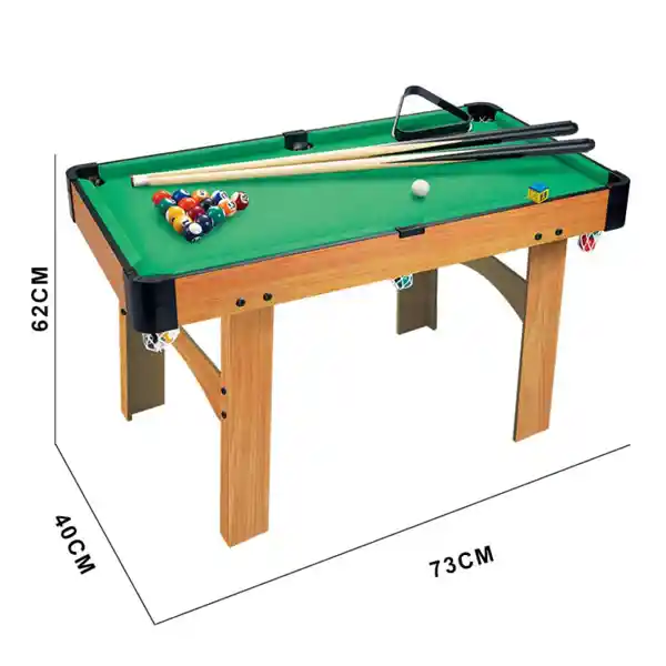 Dale a tus hijos horas de diversión con la mini mesa de pool Kidscool. Su diseño compacto y ligero de madera la hace perfecta para cualquier espacio, y su set completo de pelotas, triángulo, tiza y 2 tacos te asegura que la diversión comience inmediatamente. ¡Es la mesa de pool ideal para los más pequeños de la casa! Características Esta mini mesa de pool de 73 cm de largo, 40 cm de ancho y 62 cm de alto, es perfecta para jugar en cualquier lugar. Fabricada en madera, es compacta y no es plegable. Incluye todo lo necesario para comenzar a jugar: pelotas, triángulo, tiza y dos tacos.