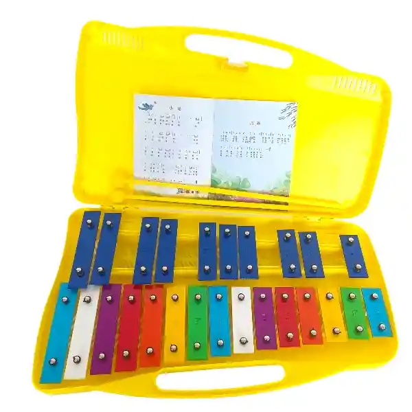 Metalófono de 25 teclas de metal con 2 baquetas plasticas. Viene en una caja estilo maletin plastico de color amarillo. Ideal para uso escolar, especialmente para aquello que esten comenzando a aprender a tocar este instrumento. El metalofono tiene un sonido suave y dulce que puede ir desde graves a agudos con un tintineo inconstante. Medidas: 40x23x6cm