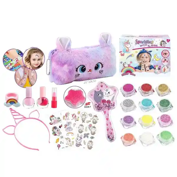 Un estuche soñado para brillar y jugar! Este adorable estuche de peluche de 20×10 cm viene cargado de sorpresas para dejar volar la imaginación. Incluye un set de stickers tipo tattoo para pegar en la piel, un cepillo de pelo, glitter de colores, esmaltes divertidos y cintillo de unicornio llenos de magia. Ideal para jugar, crear looks únicos y sentirse como toda una estrella. Perfecto para regalar o llevar a todas partes. Medidas: 22x17cm caja