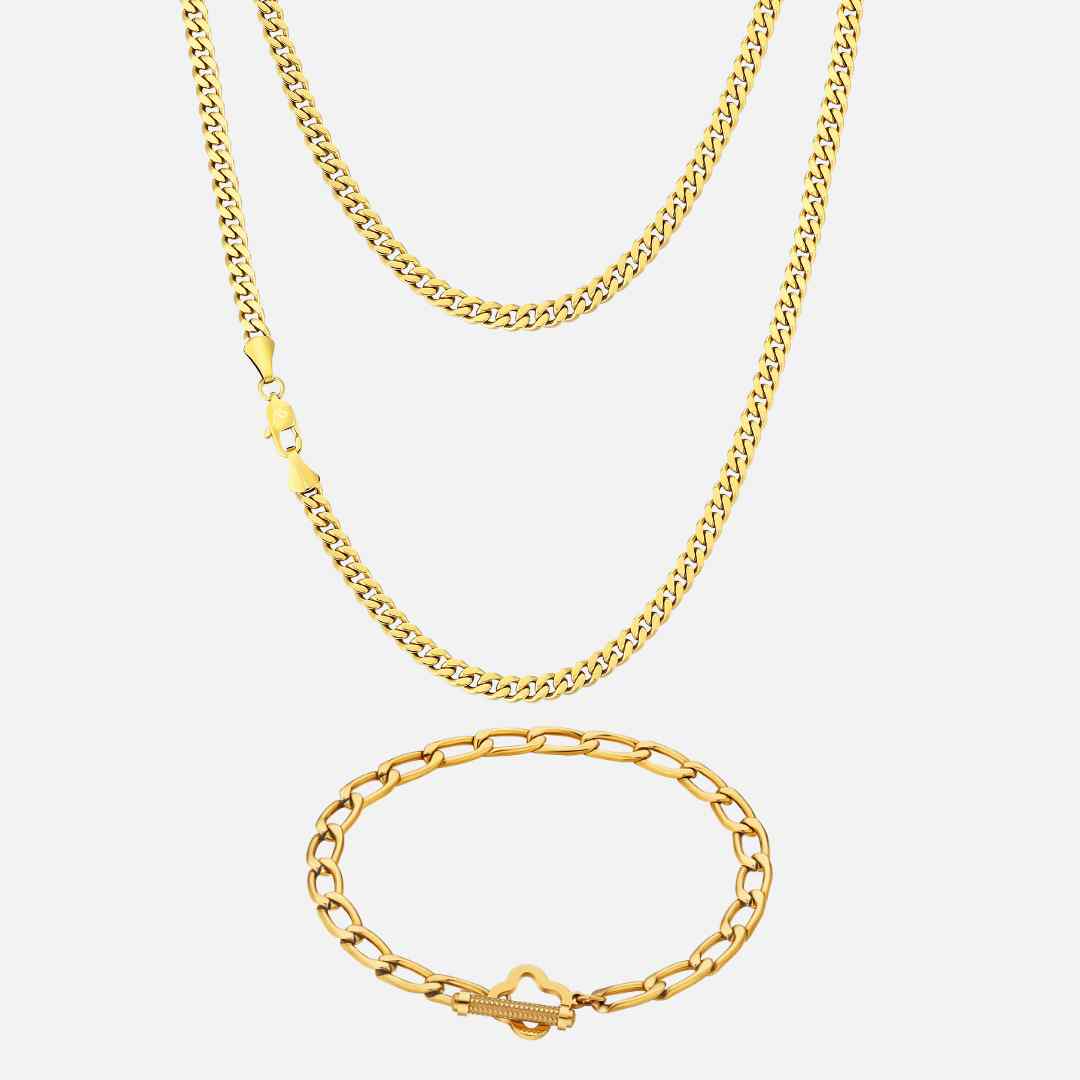 Características✓ Acero inoxidable 316L✓ Rodio✓ Resistente al agua, sudor y calor✓ Hipoalergénico (sin piel verde)✓ Enchapado Oro 18k y Oro 14k 2.5 micras Incluye:- Cadena Miami Cuban Oro 5mm 60cm- Pulsera Link OT Oro 4mm