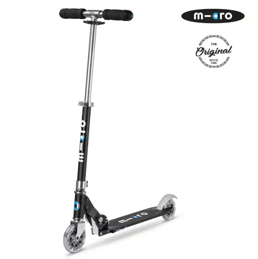 Micro Scooter Sprite negro De impecable construcción suiza y una calidad sin igual, el scooter Micro Sprite es la introducción perfecta al scooting en 2 ruedas porque es ligero, fácil de manejar y duradero. Es plegable lo que lo hace muy conveniente para transportar y guardar. La patita de apoyo permite que el scooter pueda mantenerse en pie por sí mismo. La altura del manubrio es ajustable para adaptarse a los distintos miembros de la familia. Características: Edad: 6 años en adelante. Altura del conductor: Hasta 152 cm. Resiste: hasta 100 Kg Tipo de superficie: asfalto. Altura del timón: 65 a 95 cm Peso del scooter: 2,85 kg Tamaño de la caja del scooter: 65,5 x 11,5 x 25 cm Material: aluminio, plástico, silicona Procedencia: Marca de Origen Suizo. Ganador de premios de ingeniería.