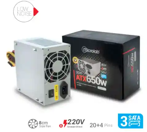 ATX 650W Power Supply, fuente de Poder, 650W de potencia, conector 20/24 Pines, ventilador de 8cm, formato ATX, versión ATX 2.0, cable de poder incluido, 8cm, size Fan 12, 220V 20+4 Pins. connect Direct 3 Conectores y extensiones Primer Ramal Cables: 1 molex, 1 Sata, 1 Floppy, segundo Ramal Cables 1 Molex, 2 Sata, extensión Conector 20/24, extensión Conector 4/4 CPU, extensión PCIE 6.