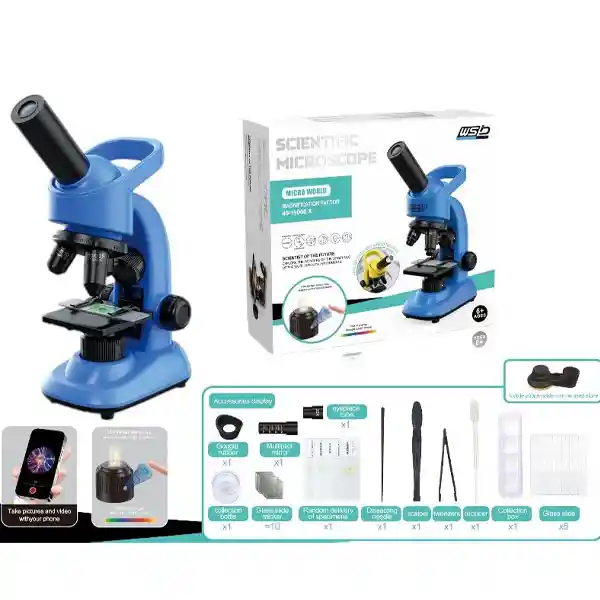 Microscopio para niños ofrece un gran aumento para aplicaciones educativas con aumentos de 40x y más. Cabezal de visualización monocular con LED y permite visualizar la imagen en la pantalla del celular. Con la luz LED y el diseño de ángulo ajustable de la lente, su hijo puede observar objetos desde el mejor ángulo de visión. Fácil de instalar y fácil de usar, la imagen es brillante y clara. Medidas: 28x24cm caja