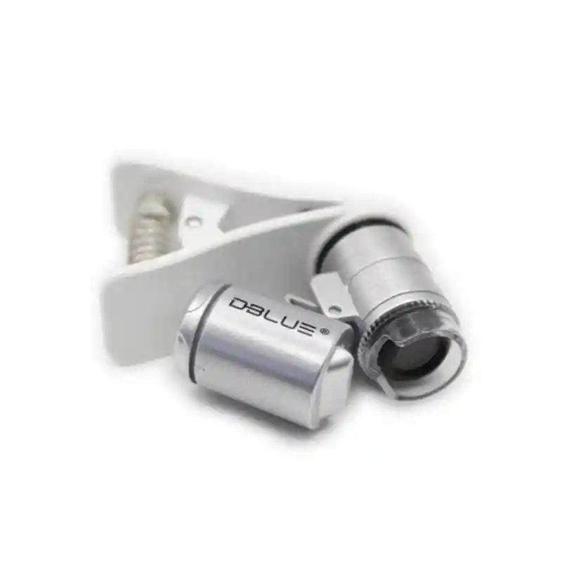- Microscopio universal para smartphones. - Material: ABS + metal. - Alimentación: 3 LR1130 pilas de botón (no incluido). - Tamaño: 6x2.2x6.5 cm. - Peso neto: 40g . - Portable: Mini tamaño con un peso ultraligero. - 2 en 1 Diseño lupa de energía 60x y detector ultravioleta. - Luz led brillante de la lupa ( para zonas con poca luz). - Puedes ver los objetos de forma clara y precisa. - Perfecto para fines industriales, monedas, sellos, joyas, jardinería y otros.