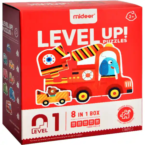 La serie Level Up Puzzles son rompecabezas divertidos y educativos con una belleza artística que ayudarán a desarrollar el potencial cerebral de los niños paso a paso. Dividida en siete niveles, esta serie coincide con el desarrollo mental de los niños, con el objetivo de mejorar su pensamiento lógico, coordinación ojo-mano, cognición multidimensional y desarrollar su concentración. De 2 a 247 piezas, simples a complejas, las ilustraciones de esta serie, dibujadas por una artista e ilustradora francesa, Maud Lienard, brindan a los niños una experiencia estética de alta calidad. Nivel 1 Incluye 8 puzzles progresivos de vehículos, 1 de pcs, 2 de 3pcs, 2 de 4pcs, 2 de 5pcs, y 1 de 6pcs