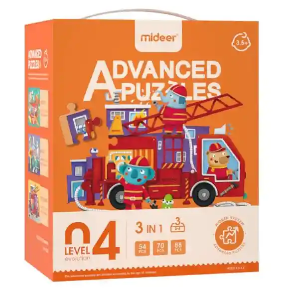 La serie Advanced Puzzle son rompecabezas divertidos y educativos con una belleza artística que ayudarán a desarrollar el potencial cerebral de los niños paso a paso. Dividida en siete niveles, esta serie coincide con el desarrollo mental de los niños, con el objetivo de mejorar su pensamiento lógico, coordinación ojo-mano, cognición multidimensional y desarrollar su concentración. De dos a doscientas cuarenta y siete piezas, simples a complejas, las ilustraciones de esta serie, dibujadas por una artista e ilustradora francesa, Maud Lienard, brindan a los niños una experiencia estética de alta calidad. Nivel 4 Incluye 3 puzzles de vehículos, aviones 54pcs, cohete 70pcs, bombero 88pcs. Edad Recomendada de 3 años en adelante.