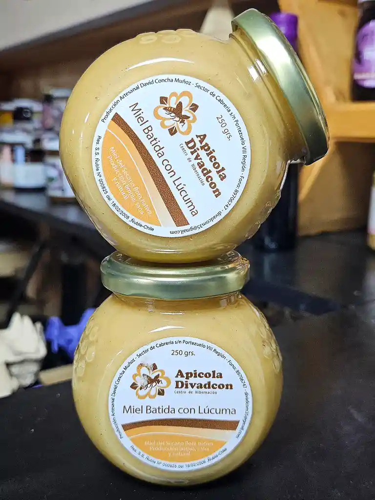 Miel Batida 100% Natural con Lúcuma. Multifloral nativa, procediente del Secano en la región de Ñuble. Frasco de 250 grs.