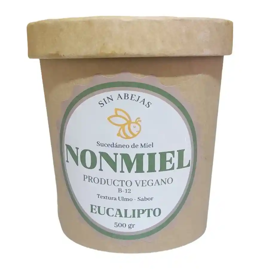 Miel Vegana Sabor Eucalipto de 500gr fortificada con Vitamina C y B12. Marca NONMIEL. Es igual, pero sin las abejas. Ingredientes: Fructosa, glucosa, agua purificada, ácidos orgánicos conservante y tricarboxilíco, esencias frutales y o vegetales.