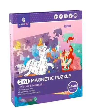 Este juego de rompecabezas magnético portátil 2 en 1 Unicorn & Mermaid, presenta un juego progresivamente desafiante diseñado para guiar a los niños pequeños desde el enfoque hasta el pensamiento general. Desarrolle la concentración a través de la observación cuidadosa y el juicio, perfeccionando importantes habilidades de coordinación ojo-mano. Los rompecabezas magnéticos son aptos para explorar y resolver a partir de los 3 años. Material: papel, imán. Incluye: 72 piezas de rompecabezas magnéticas