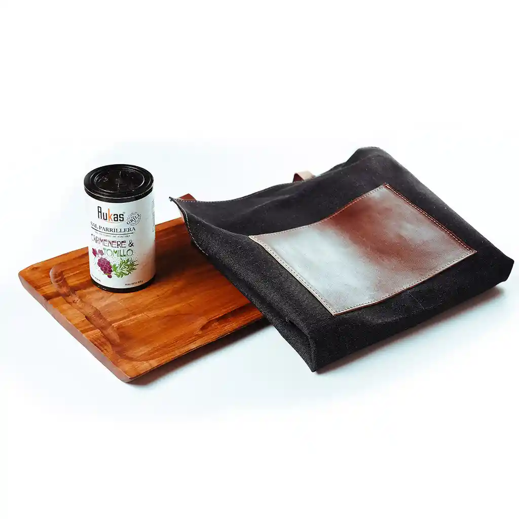 Perfecto para los parrilleros de la casa. Pack tabla (45x23 cm), sal Carmenere y pechera de mezclilla, MILENARIA