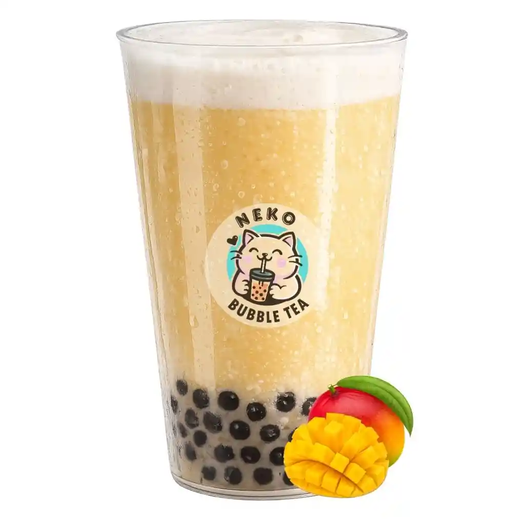 Mango fresco con leche natural entera, té negro, hielo y tapioca.