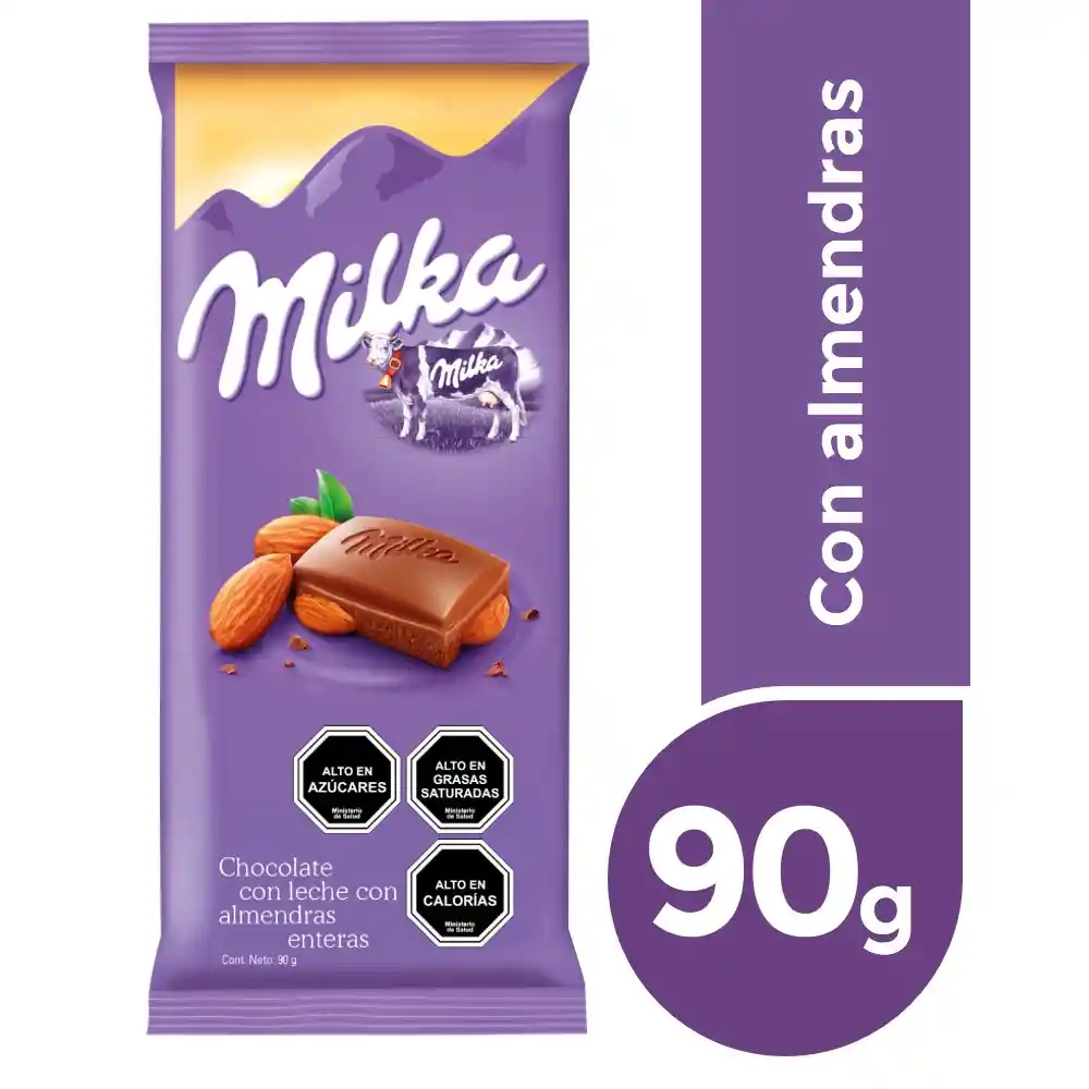 Chocolate milka de leche de los Alpes, relleno con almendras enteras, presentación en bolsa 1 x 90 g.
