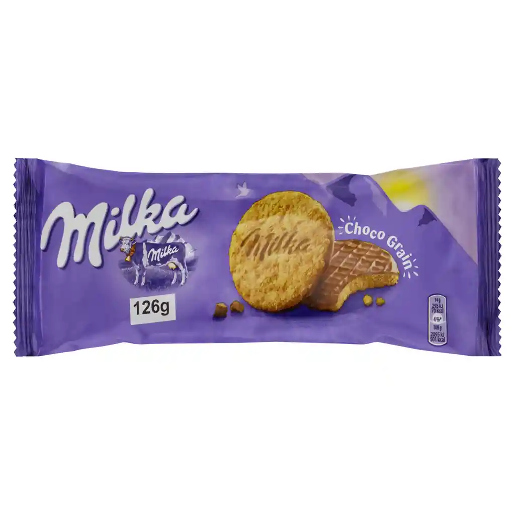 Milka Choco Grains esta hecha de harina de trigo trigo integral avena y una delicada capa de chocolate con leche alpina Milka es una experiencia de sabor para todos los amantes de las galletas de chocolate.Galletas con avena arrollada harina integral y Chocolate con Leche Alpina.