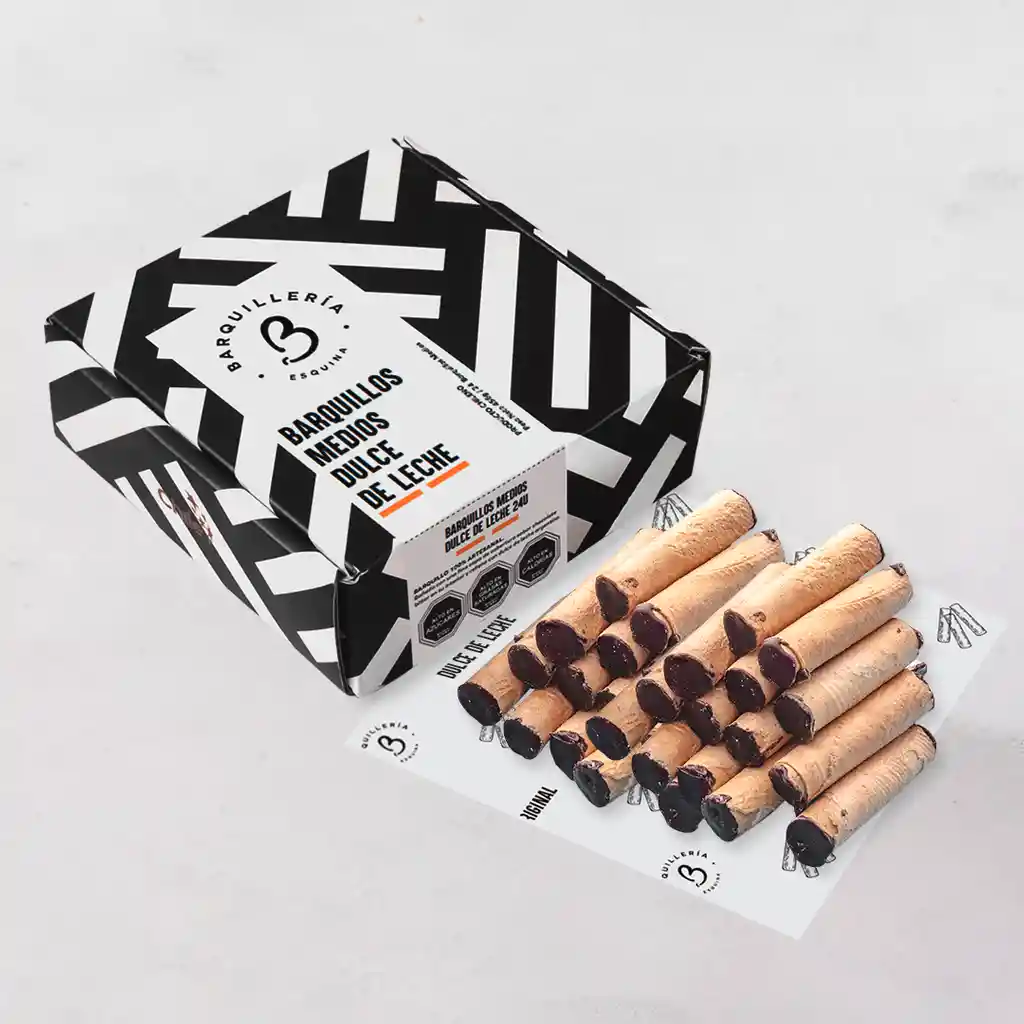 Caja de 24 mini barquillos 100% artesanal bañados con una fina capa de cobertura de chocolate bitter en su interior y relleno de dulce de leche caramelizado. Contiene gluten, soya y leche. Elaborado en líneas que también procesan huevo, almendra y nueces. Medidas del barquillo: 6 cm de largo x 1,5 cm de diámetro aprox. Son productos artesanales elaborados a mano por nuestros barquilleros por lo que puede variar el tamaño entre ellos, pero nunca el amor con que se hacen. Se calculan para una celebración, 4 barquillos por persona. Recomendación: Mantener en un lugar fresco y seco (20º) y 65% humedad.