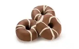 Pequeña dona bañada completamente en delicioso chocolate de leche y rayas de chocolate blanco, porción individual.