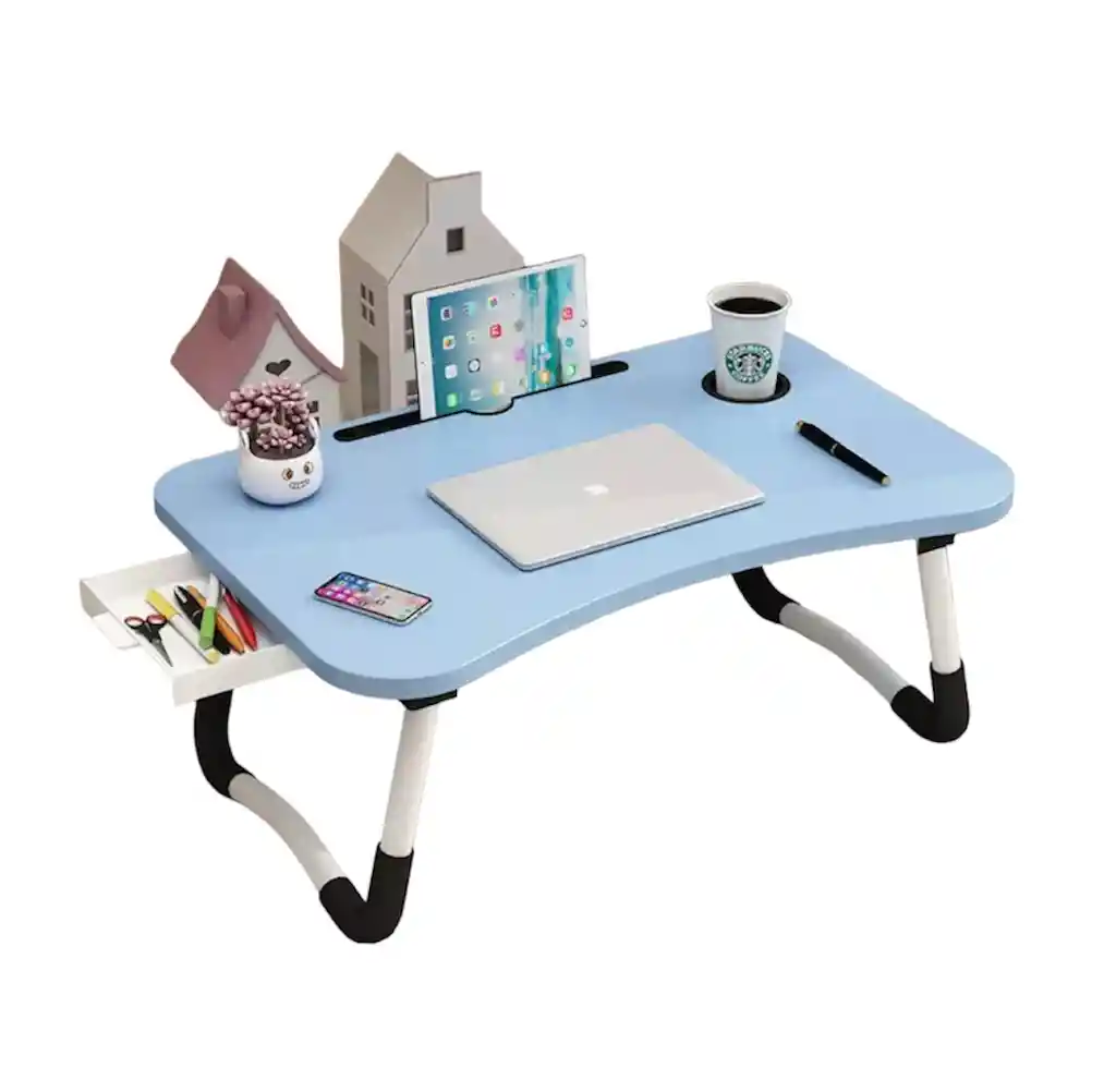 Mini estante plegable con patas de colores para estudiar . Este mini estante plegable será ideal para usarlas cuando estés en la cama o en el sofa, y así usar tu computador o estudiar! Disponibles en 5 colores. Viene con un posa vasos y para apoyar tus libros o dispositivos. Material: Metal, plástico Medidas: Alto: 28cm Profundidad: 40cm Largo: 60cm