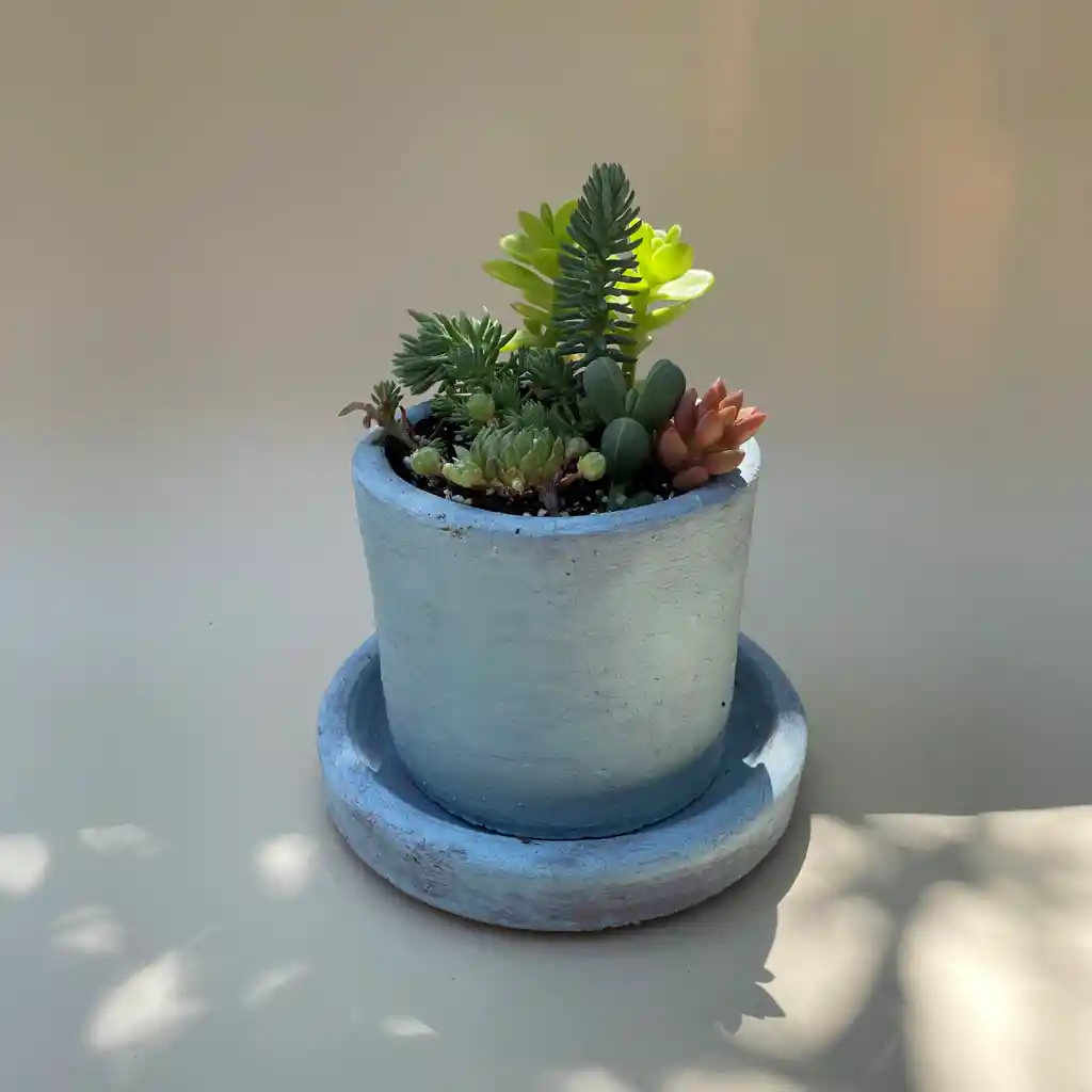 Mini Jardín de Suculentas de 8cm de diámetro en macetero de greda celeste. Tiene más de 3 suculentas pequeñas en su interior.