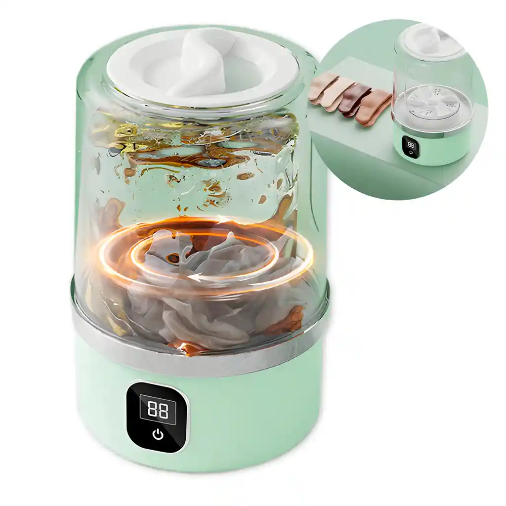 Mini lavadora Portátil Verde Recargable Ropa de Bebé 1 LT Esta lavadora mini portátil pesa solo 1,2 KG, lo que la hace extremadamente liviana, fácil de trasladar y perfecta para espacios pequeños. Es una excelente opción para quienes viven en departamentos, dormitorios estudiantiles o viajan frecuentemente. También es ideal para llevar a hoteles o usar en actividades al aire libre como camping. Su tamaño compacto permite guardarla cómodamente en cualquier rincón, ya sea bajo la cama, dentro de un mueble o entre estanterías, sin ocupar demasiado espacio. Fabricada con materiales seguros y resistentes como ABS y silicona apta para uso alimentario, esta mini lavadora cuida tu ropa y tu salud. Es una solución práctica para lavar prendas delicadas como ropa interior, ropa de bebé, calcetines o toallas pequeñas. Su tecnología simula el lavado a mano con movimientos suaves pero eficaces, logrando una limpieza profunda sin dañar las telas. No se recomienda para ropa de gran tamaño. Su sistema de lavado semiautomático permite seleccionar entre dos modos según el nivel de suciedad: uno de 5 minutos para una limpieza rápida y otro de 10 minutos para un lavado más intenso. Solo necesitas llenarla con agua hasta 2/3 de su capacidad para obtener los mejores resultados. Aunque no incluye sistema de centrifugado, su practicidad y eficiencia la convierten en una excelente opción para el lavado diario de prendas pequeñas. Cuenta con una batería de 3000 mAh de alto rendimiento, lo que permite su uso incluso sin conexión directa a la corriente, aportando comodidad y autonomía. Funciona con una potencia de 12W y frecuencia de 20 Hz, ofreciendo un equilibrio entre eficiencia energética y buen rendimiento. Con una capacidad aproximada de 1 litro y un diseño que mide cerca de 12,5 x 12,5 x 20 cm, esta lavadora es una excelente alternativa como electrodoméstico auxiliar. Además, puede convertirse en un regalo útil y original para familiares, estudiantes o cualquier persona que necesite una solución de lavado práctica y portátil. Especificaciones: Diseño: 3 Ganchos. Color: Verde Tamaño: 12,5 x 12,5 x 20 cm Uso: Lavado de prendas por unidad. Peso: 1,2 KG Batería: 3000 mAh Contenido de paquete: 1 Mini lavadora Portátil 1 LT