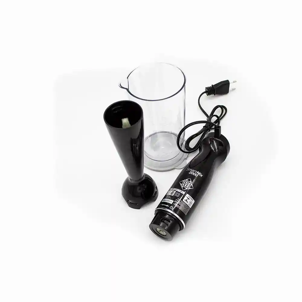 El SmartMix 200 de Telefunken es una minipimer de mano con un diseño ergonómico compacto fácil de utilizar y limpiar. Te permite preparar batidos salsas jugos y mucho más con sus cuchillas de acero inoxidable ultra filosas y su sistema anti-splash. Incluye vaso licuador de plástico con capacidad de 700ml y tapa de goma. Minipimer de Mano. Diseño ergonómico y compacto. Cuanta con dos velocidades. Sistema anti splash. Trabaja a una potencia de 500w. Incluye licuador y vaso licuador de plástico con capacidad de 700ML y tapa de goma para vaso. Cuchillas de acero inoxidable ultra filoso. Turbo EFFICIENT.