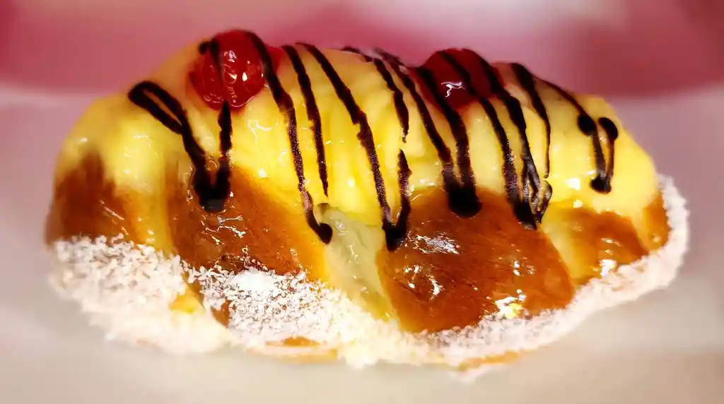 Deliciosa msaa dulce horneada, rellena con crema pastelera, cubierta con coco rallado y marrasquinos en la superficie.