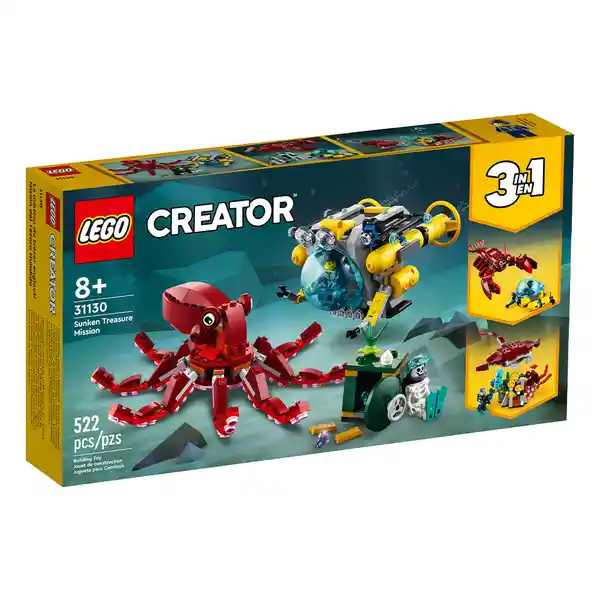 Los niños a partir de 8 años se lo pasarán genial interpretando emocionantes aventuras subacuáticas con el increíble set LEGO® Creator 3en1 Misión del Tesoro Hundido (31130). Incluye un submarino, un pulpo gigante articulado de juguete, 2 minifiguras y una caja fuerte con lingotes de oro y joyas. Diversión creativa sin límites para pequeños constructores Tu peque disfrutará de 3 experiencias de construcción y juego con este set LEGO Creator 3en1. Puede construir el submarino y el pulpo de juguete y, después, convertirlos en un submarino más pequeño y una langosta gigante. Además, luego podrá crear una escena con una enorme mantarraya, un buceador y un arrecife de coral con una cuevita, o usar su imaginación y los mismos ladrillos para dar forma a modelos de su invención. Diversión interactiva para fans de LEGO Los juguetes LEGO vienen con instrucciones de construcción digitales, disponibles en la app Instrucciones de Montaje LEGO, que aportan aún más diversión a la experiencia. • Juguete 3en1: Tu joven constructor no parará de crear y divertirse con el set LEGO® Creator 3en1 Misión del Tesoro Hundido (31130), que contiene 3 modelos en 1 (un pulpo, una langosta gigante y una enorme mantarraya). • Infinitas posibilidades de juego: Los niños podrán elegir interpretar historias con un pulpo y un submarino, con una langosta gigante y un submarino más pequeño, o con una enorme mantarraya, un buceador y un arrecife de coral. • Animales marinos articulados: El pulpo puede mover la cabeza y los tentáculos, la langosta gigante puede mover los ojos, las pinzas, las patas y la cola, y la enorme mantarraya puede mover la cola y los extremos de las aletas pectorales. • Rebosante de detalles: El submarino cuenta con cabina, cámara, hélices y escotilla de carga. El submarino más pequeño está equipado con cabina y hélices, y el arrecife de coral esconde una cueva secreta. • 2 minifiguras: Cada modelo trae 2 minifiguras (un esqueleto y un tripulante de submarino o un buceador) que protagonizarán las emocionantes historias inventadas por los peques. • Para pasarlo genial construyendo: Este set de 522 piezas ofrece a los niños de 8 años o más una gratificante experiencia de construcción; además, es un regalo creativo ideal para apasionados fans de LEGO®. • Juego portátil: Mide aproximadamente 8 cm de altura, 12 cm de longitud y 10 cm de anchura, un tamaño que permitirá a los peques llevarse el submarino de juguete a cualquier parte. • Construcción digital interactiva: Con la app Instrucciones de Montaje LEGO®, los jóvenes constructores pueden visualizar, acercar y girar una versión digital de su modelo en sus smartphones y tabletas. • Calidad extraordinaria: Desde hace más de 6 décadas, nuestros ladrillos LEGO® se fabrican con la total garantía de que van a separarse sin dificultad una y otra vez. • Seguridad acreditada: Los ladrillos para construir LEGO® satisfacen estrictos estándares