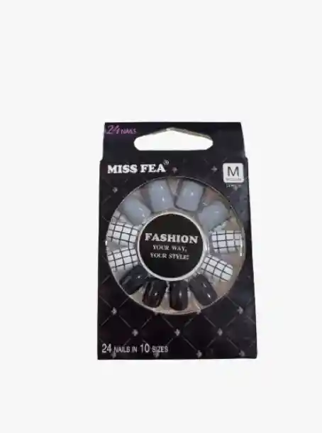 FORMA DE USO Preparación: Lave las manos con agua y jabón. Seque bien antes de preparar las uñas. Limpie las uñas con el pañuelo incluído en el kit seleccione el tamaño correcto para cada uña y disponga ordenadamente las uñas que utilizará. Las uñas vienen ordenadas por número. Consejo: Siempre aplicar las uñas de los pulgares al final. Si el tamaño que te corresponde es intermedio entre dos tamaños, elige el tamaño más pequeño. Puedes recortar las uñas y limarlas en la forma que desees después de la aplicación. Aplicación: Ubique la uña artificial sobre la uña con la pestaña transparente hacia abajo para verificar el ajuste de tamaño. Retire la lámina transparente al reverso de la uña. -Ubique sobre la uña natural, desde la zona de la cutícula, y presione por 5 segundos, primero al centro y luego hacia los lados, de izquierda a derecha. Para remover: No fuerce o retire las uñas con fuerza. Despega de los lados de la uña con cuidado ó aplica quita esmalte entre la uña natural y la uña artificial. Espera 1 minuto y desprende. Si lo requieres, usa el palito de manicura para ayudar a retirarlas. Advertencia: Mantener fuera del alcance de los niños. Talla M, INCLUYE 24 UÑAS