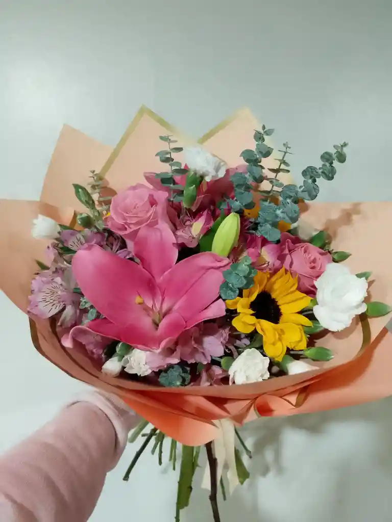 Ramo de 3 rosas, 3 lilium, 3 girasoles, varias varas de alstromerias en tonos rosados, mini claveles blancos y eucalipto.