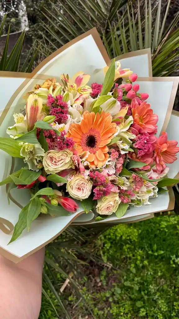 Hermoso mix floral compuesto por astromelias, mini rosa y gerbera Colores segun Disponibilidad