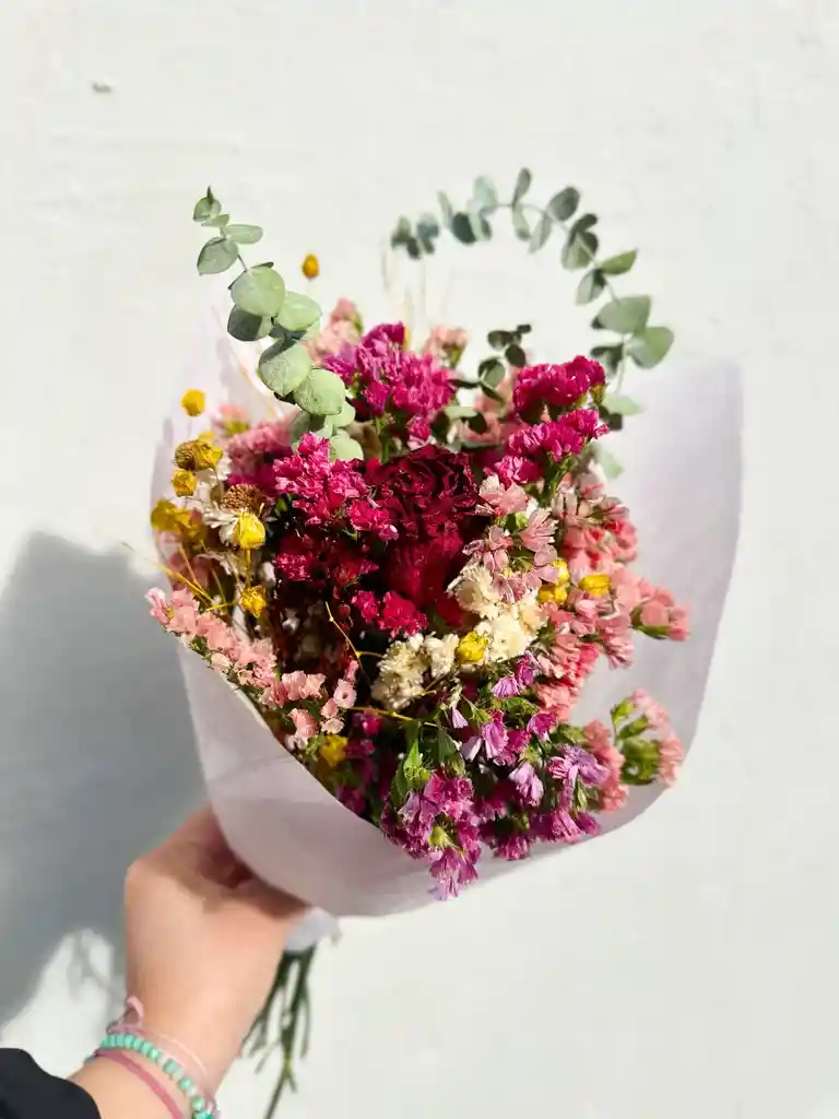 MIX CON FLORES SECAS Y PRESERVADAS COLORIDO (ROSA, FUCSIA, CAFÉ, CREMA)