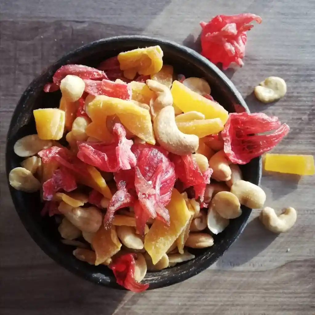 Flor de hibisco, habas saladas, mango y caju sin sal