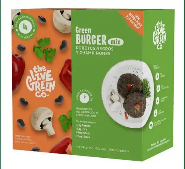 Mix para Hamburguesas Porotos Negros y Champiñones. Cada caja tiene la mezcla para 4 hamburguesas. No necesita refrigeración ni congelación, fácil de cocinar, solo necesita agregar agua, hacer hamburguesa y cocinar.