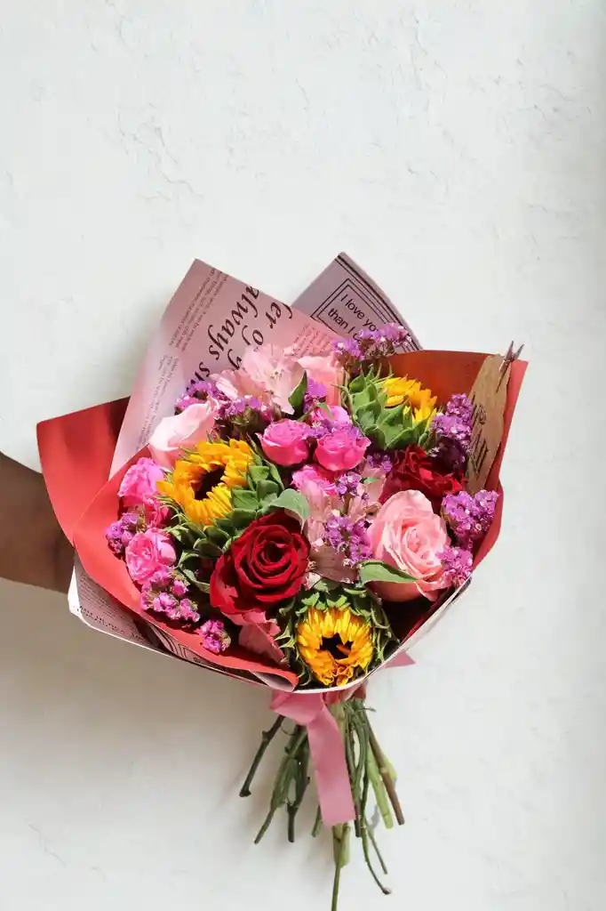 LINDO RAMO COLORIDO CON 3 VARAS DE GIRASOLES, 6 ROSAS Y 10 VARAS DE OTRAS FLORES