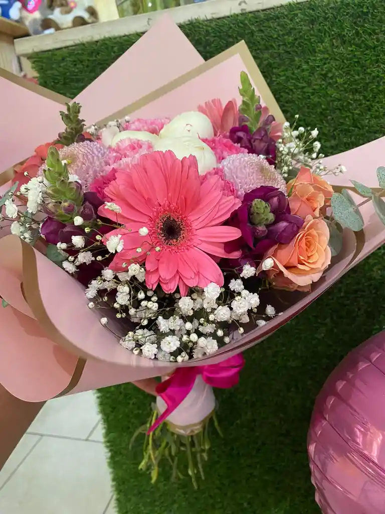 Mix de Flores Rosadas, claveles, gerberas, minirosas y lluvia + papel coreano + lazo decorativo