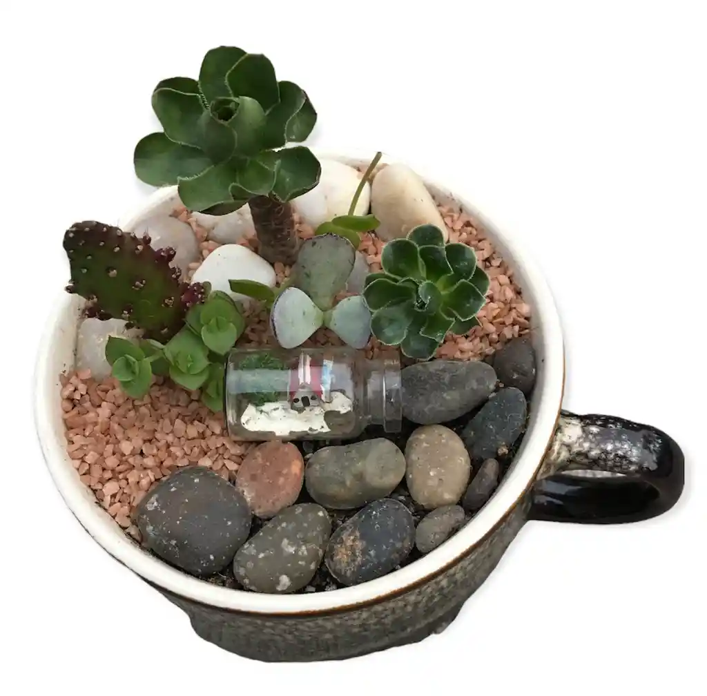 Mix Suculentas con piedras blancas, piedras naturales y piedritas naranjas maceta un mango degradado café botella naufragio casa Suculenta ideal para decorar interiores o exteriores Modelo único por unidad 7 x 12 cm Plantas Naturales