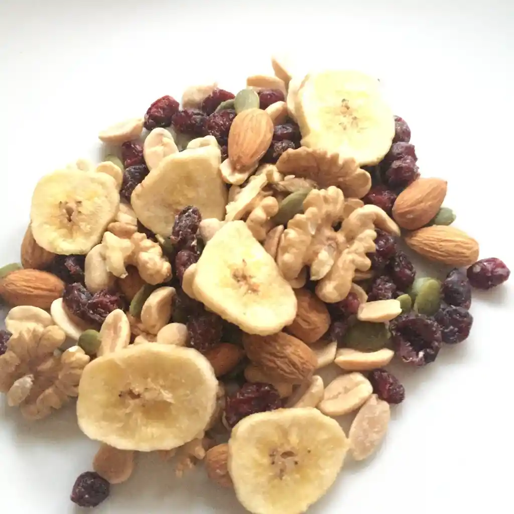 Que contiene: Almendras, Maní sin sal, Semilla Zapallo, Cranberry y Platanitos Chips. Contiene: Almendras, Nuez mariposa, Castañas de cajú y Avellanas Europea tostada.