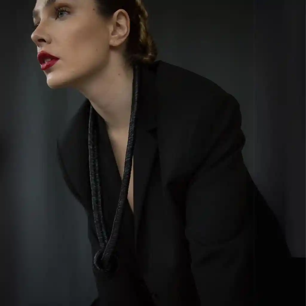 Collar elasticado color negro más cadena dorada de fantasía. Tamaño 100 cm de largo x 3 cm de ancho. Producto Lavable. Producto elaborado a mano por mujeres en situaciones vulnerables a lo largo de Chile.