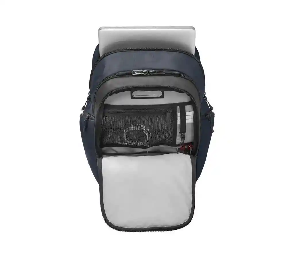 Características clave Bolsillo de neopreno en la correa para hombro para tener a mano su Navaja Suiza Bolsillo de malla con cierre, llavero, porta plumas, etiqueta para nombre, dos bolsillos para accesorios y portadispositivo USB elástico Con correas para hombro mejoradas y acolchado trasero para máxima comodidad, inteligentes canales de aire, un pasaje para carro y un bolsillo trasero oculto
