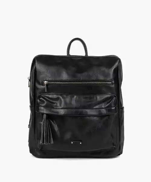 Color Negro. El Bolsillo Principal es Con Cierre. En el Exterior Tiene Dos Bolsillos Con Cierre Uno de Ellos Con Borla. En el Interior Tiene un Bolsillo Con Cierre y Dos Abiertos. En la Parte Posterior Tiene un Bolsillo También Con Cierre.
