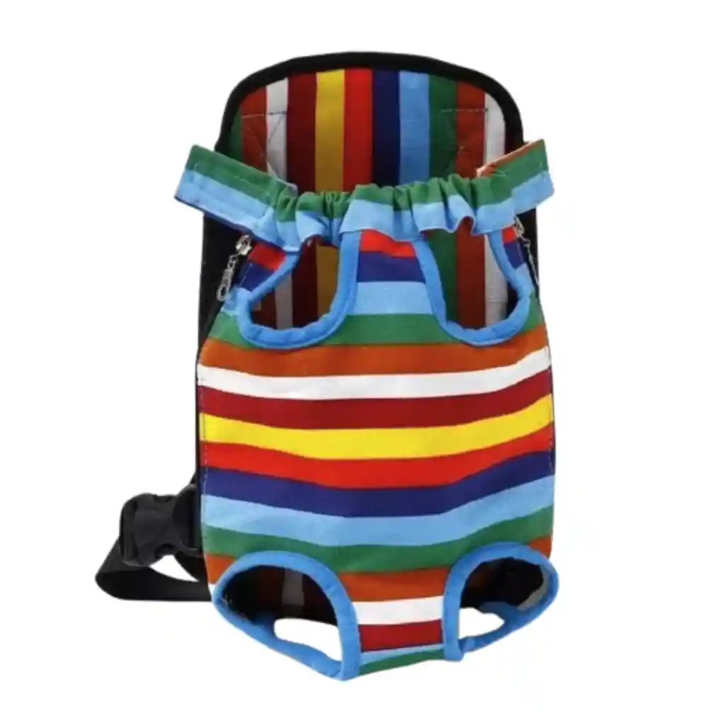 Se trata de una mochila transportadora para mascotas con un diseño de estilo canguro y rayas de colores, ideal para perros pequeños y gatos. Uso: Permite llevar a tu mascota de forma segura en la espalda o en el pecho, con las patas y la cabeza fuera. Material: Confeccionada en tela de lona (ligeramente acolchada) y malla transpirable para una buena ventilación y comodidad. Características: Correas ajustables y acolchadas para el confort del portador. Cierres laterales para facilitar la entrada y salida de la mascota. Diseño duradero y lavable. Adecuado para: Generalmente se recomienda para perros y gatos de razas pequeñas, con un peso de hasta aproximadamente 9 kg.