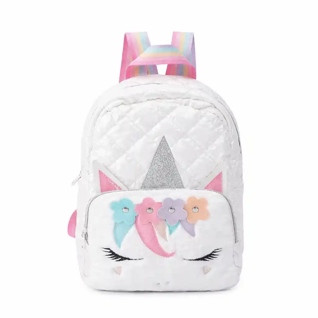 . Material: Poliester . Color: Blanco . Diseño: Unicornio . Dimensiones: 32 cm x 24 cm x 9 cm (Aprox). . Contiene: 01 Mochila Unicornio . Esta mochila infantil es ideal para los pequeños que aman los Unicornios. . Pueden llevar sus pertenencias de manera cómoda y divertida. . El diseño incluye Unicornio . Tiene compartimento principal amplio y adicional su bolsillo frontal con cierre de cremallera para accesorios pequeños. . Sus asas son ajustables con tirantes acolchados para mayor comodidad. . Ideal para guardar libros, cuadernos y útiles escolares o perfecta para excursiones, paseos o actividades al aire libre.