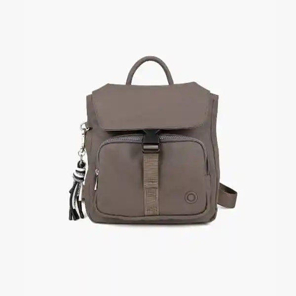 Mochila con flap y llavero de cuerdas. En el interior tiene un bolsillo con cierre y dos abiertos. En la parte frontal tiene un bolsillo con cierre.