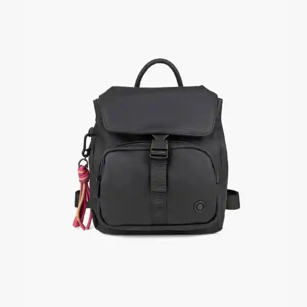 Mochila con flap y llavero de cuerdas. En el interior tiene un bolsillo con cierre y dos abiertos. En la parte frontal tiene un bolsillo con cierre.