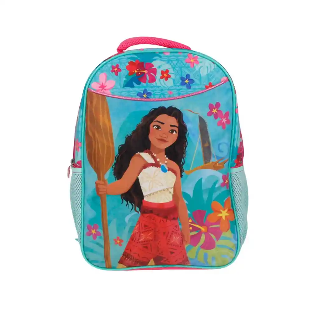 ¡La aventura comienza con cada paso! Nuestra mochila infantil de 15"", del increìble mundo de Moana, es el compañero perfecto para el regreso a clases. Ligera, espaciosa y cómoda, esta mochila está diseñada para acompañar a los niños en cada uno de sus días escolares, desde las primeras clases hasta las actividades extraescolares. Con un diseño divertido y colorido, será su aliada para llevar libros, cuadernos, y todo lo que necesiten con estilo y diversión. Porque aprender también puede ser una aventura: Esta mochila tiene todo lo necesario para mantener organizados los útiles escolares. Su compartimento principal ofrece amplio espacio para libros y cuadernos, mientras que los bolsillos exteriores son perfectos para llevar pequeños objetos personales, como una botella de agua o una merienda. Además, las correas ajustables y acolchonadas aseguran una gran comodidad para que los niños puedan llevarla todo el día sin sentir peso. Un diseño pensado para cada momento: Con materiales duraderos y resistentes, nuestra mochila de 15"" es ideal para el día a día. Con un diseño práctico, pero lleno de estilo, hará que cada niño se sienta lleno de energía y listo para enfrentar su jornada escolar. ¡El regreso a clases nunca fue tan emocionante y lleno de posibilidades! Medidas Mochila: 30 x 12 x 39 cms. Capacidad Mochila: 14 litros. Materialidad: Poliester