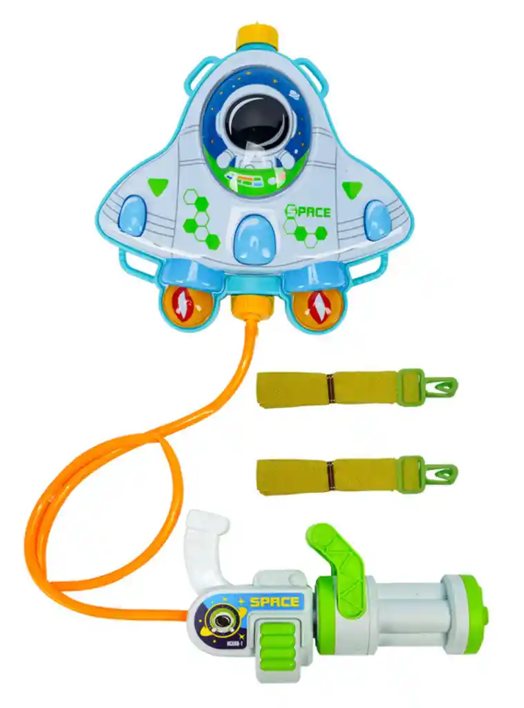 Características: . Divertida pistola de agua con mochila en forma de nave espacial. . Su diseño colorido y temático hace que los niños se sientan como en una aventura . espacial mientras disfrutan del agua y el verano. . Promueve la diversión al aire libre fomentando la creatividad e imaginación. . Desarrolla habilidades motoras y sociales al compartir y jugar con otros. . Fácil de usar y rellenar, con correas ajustables para adaptarse al tamaño del niño. . Perfecta para juegos en la playa, piscina, jardín o parque. Especificaciones Diseño: Nave Espacial Capacidad del depósito: 1200 ml. Tamaño de la mochila: 22.5 cm x 21.5 x 7 cm aprox. Material: Plástico resistente y liviano. Incluye: Mochila con tanque de agua, pistola con manguera y correas ajustables.