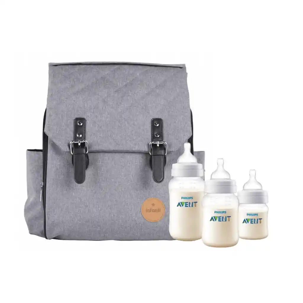 MOCHILA MATERNAL ASPEN GRIS Con la Mochila Maternal Aspen Gris de Infanti, podrás llevar todos los artículos tuyos y de tu bebé, ¡siempre de forma cómoda y segura! Espaciosa y confortable, pensada especialmente en brindarte todos aquellos espacios esenciales para trasladar todos aquellos artículos indispensables para tu bebé. Su amplio bolsillo principal es complementado con un bolsillo delantero con 2 compartimientos térmicos para almacenar leche o agua. Además, esta mochila cuenta con un bolsillo lateral derecho con cierre para guardar toallitas húmedas, un bolsillo trasero escondido para guardar documentos y llaves, y 6 prácticos bolsillos interiores para organizar pañales, ropa y otros accesorios. Sus tirantes ajustables y acolchados te brindan una experiencia de uso mucho más cómoda y agradable, y sus correas para colgar del mango del coche te facilitan la movilidad quitándote el peso. ¿Lo mejor? ¡Incluye un práctico y útil mudador! ¡Cuidamos lo que más amas! Características: Mango superior Gran bolsillo delantero con 2 compartimientos térmicos para almacenar leche o agua. Correas para colgar del mango del coche. Bolsillo lateral derecho con cierre para guardar toallitas húmedas. Tirantes ajustables y acolchados. 6 bolsillos interiores para organizar pañales, ropa y otros accesorios. Bolsillo trasero escondido para guardar documentos y llaves. Incluye mudador. Set de Mamaderas Anticólicos. Clínicamente comprobado que reducen los cólicos y los malestares.*Este set incluye 3 mamaderas anticólicos de 125 ml con tetina de flujo para recién nacido, de 260 ml con tetina de flujo medio y de 330 ml con tetina de flujo rápidoCon válvula anticólicos diseñada para mantener el aire lejos de la pancita del bebé para reducir el malestar60% menos malestar durante la noche*Tetina con textura acanalada que evita la contracción permitiendo una alimentación ininterrumpidaAntigoteo para una alimentación agradableCuello ancho y menos piezas para facilitar la limpieza y el montajeForma ergonómica para sujetar fácilmente0% BPACompatible con toda la gama Philips Avent y con las tetinas de diferentes niveles de flujoOrigen: Brasil.* Los bebés de dos semanas alimentados con mamaderas Philips Avent presentaron menos cólicos y una reducción significativa de la irritabilidad durante la noche, que aquellos alimentados con mamaderas de otras marcas.