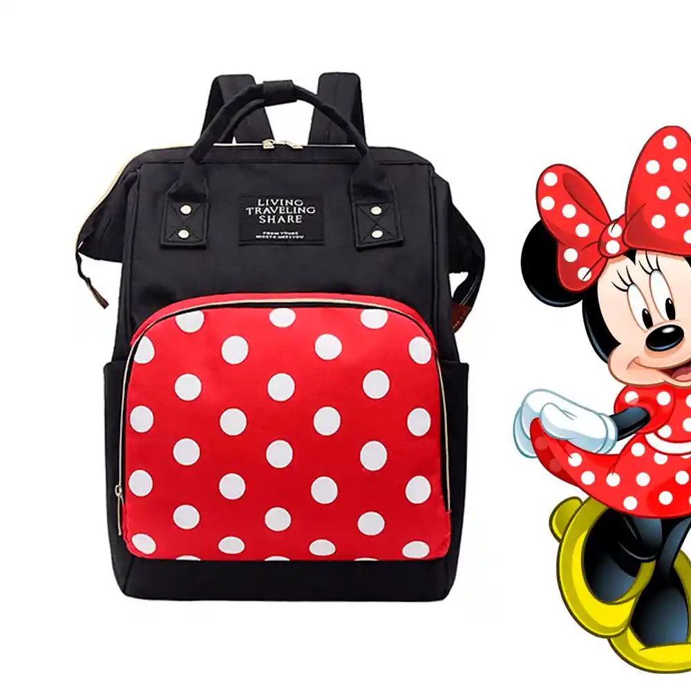 Características: Moderna mochila maternal con diseño de organizadores para ordenar fácilmente los artículos esenciales del bebé. Bolsillo exterior impermeable, fácil de limpiar, con compartimentos térmicos para 3 botellas. Calidad superior y ergonómica además está hecha de tela de poliéster resistente al agua. Con diseño de colores alusivos a Mickey y Minnie simbólicos personajes de Disney. Especificaciones: Material: Tela Oxford + Poliéster. Color: Negro + Rojo. Diseño: Minnie / (Según Disponibilidad) Tamaño: 50 cm x 30 cm / Profundidad 20 cm aprox Contenido: 1 Mochila Maternal