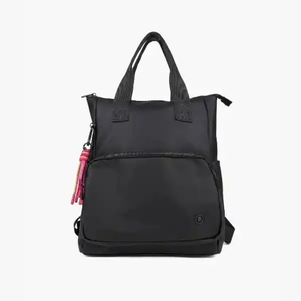 Mochila con llavero de cuerdas. En el interior tiene un compartimiento para guardar computador de 13 a 15 pulgadas y dos bolsillos abiertos. Tiene bolsillos en los costados y un bolsillo con cierre en la parte frontal.