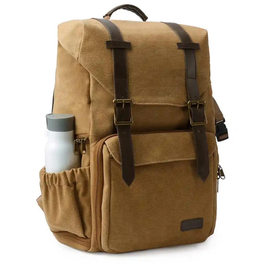 Notebook hasta 15” Impermeable Ideal para viajes 25L Gran capacidad 29.21 cm de largo x 17.78 cm de ancho x 43.94 cm de alto. El espacio de almacenamiento superior sirve para guardar ropa. La zona inferior sirve para almacenar una cámara DSLR con aproximadamente 3-5 lentes estándar más otros accesorios. Cuenta con un compartimento separado acolchado grueso para notebook de hasta 15 pulgadas. Espacio personalizable Los divisores acolchados extraíbles se pueden ajustar el espacio de acuerdo con lo que necesites al momento. Removiendo los separadores extraíbles se puede transformar fácilmente en una mochila diaria para portátil. Acceso rápido El diseño de acceso lateral te permite sacar la cámara rápidamente. El acceso con cremallera completa en la parte delantera hace que sea más fácil de usar. Los bolsillos delanteros e interiores pueden contener cables de datos, tarjetas SD y otros accesorios. 2 bolsillos laterales grandes para guardar botellas de agua y trípodes. Mantiene la cámara segura Resistente al agua: hecha de lona duradera e impermeable, incluye una cubierta para la lluvia. Incluye sistema antirrobo gracias a las cremalleras bloqueables y un gancho de metal de alta calidad. Cómoda bolsa de cámara Tiene un acolchado grueso en la espalda, generosas correas de hombro y correa ajustable en el pecho y la cintura para mayor comodidad. Especificaciones: Peso: 1.4 kg Peso máximo recomendado: 12 kg Dimensiones: 29.21 cm de largo x 17.78 cm de ancho x 43.94 cm de alto Material: Lona Color: Khaki Modelo: BM0201004AN032 Garantía: 1 año